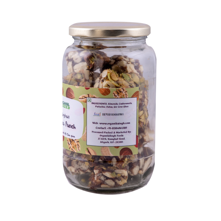 Rich Dates melted in A2 Bilona Gir Cow Ghee with generously added crunchy Cashew nuts, Almonds and shredded Pistachio.
